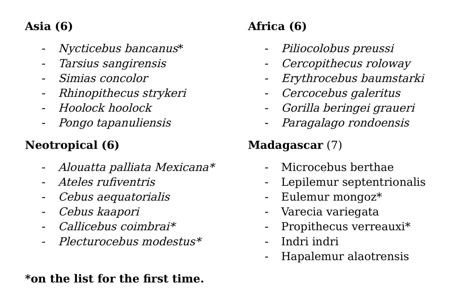 - A new list of the 25 most threatened primates has been published by the International Primatological Society, which held its 30th congress in Madagascar in July.