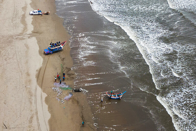 Chinchorro nets are hauled in from the shore, either by hand or by motorized vehicles. According to the Ministry of Production resolution that bans their use, it is a “very low selectivity” fishing method, meaning it captures fish indiscriminately. As a result, many fish are discarded, either because they are too small or have no market value.