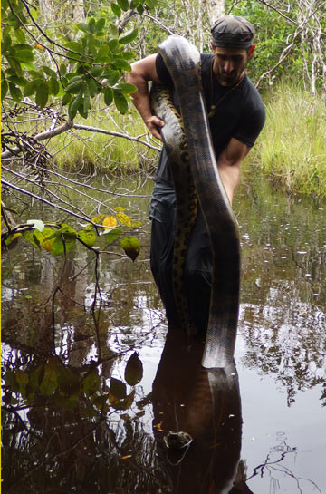 Filming for Eaten Alive. The capture of a 19 foot 200-plus pound anaconda was a great experience for us, and she was the first anaconda to ever ingest a radio transmitter in the Amazon, giving us first-time insights into the movements of large female anacondas in Amazonia. Photo courtesy of Paul Rosolie.