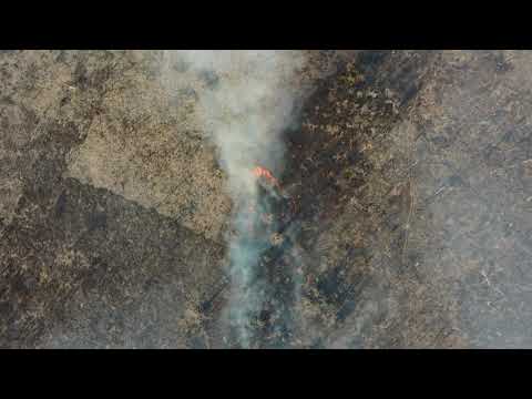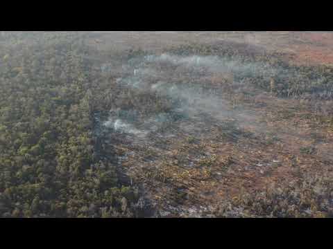 Flying over the deforested areas in some cases provided a clear view of what had replaced the forest. In some cases, the deforested land was now planted with corn or cassava (manioc). In others, the soil was just scorched or barren. In places where fires had just burned, skeletal remains of trees and charred stumps were all that remained. The drone also provided a view of active burning. Through the smoke I could see trees teetering and falling over.