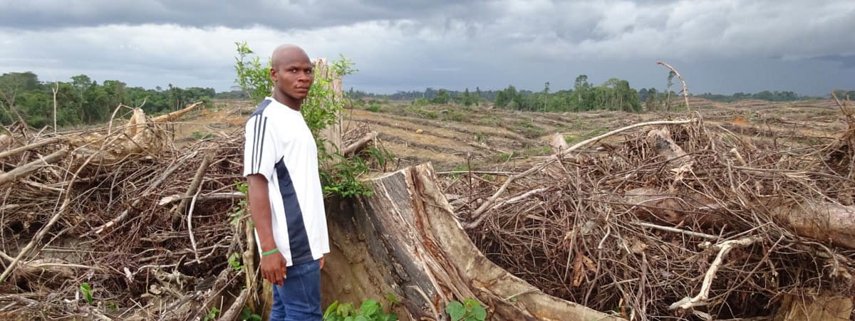A local community forest monitor. Golden Veroleum Liberia clears land disputed by the Blogbo clan even after an explicit stop-work order from the RSPO complaints panel. In May 2019 the RSPO complaints panel confirmed Golden Veroleum Liberia violated the stop-work order. Photo courtesy of Friends of the Earth.