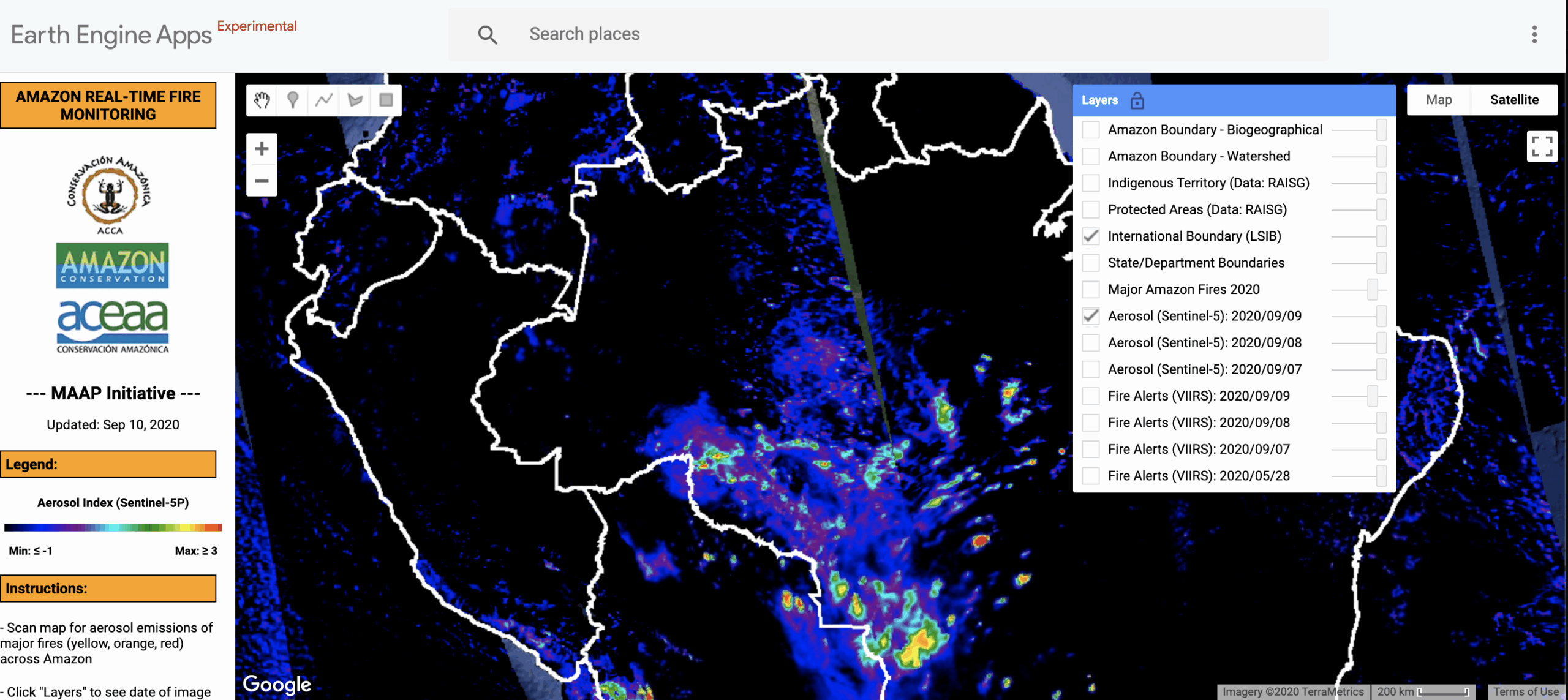 MAAP: The Amazon Real Time Fire Monitoring app uses aerosol detection data (ESA’s Sentinel-5P satellite TROPOMI data) verified with hotspot data and satellite imagery.