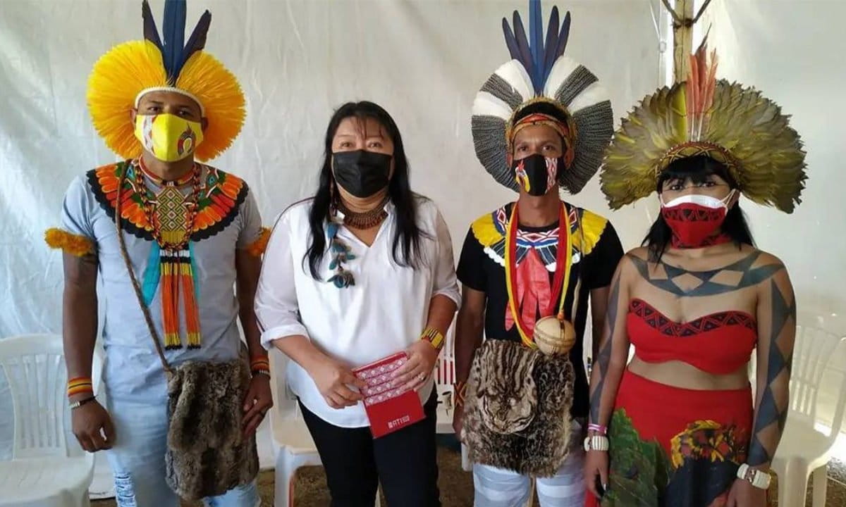 Banner image: Last year, two residents of the Naô Xohã Indigenous village – first and third from the left – met with Joenia Wapichana, the first Idigenous woman elected as federal deputy. They met in Brazilian capital Brasília during the Free Land Encampment, when Indigenous leaders met for a week to discuss and campaign for constitutional rights, demarcation, and the future for their communities. Image courtesy of the Naô Xohã community.