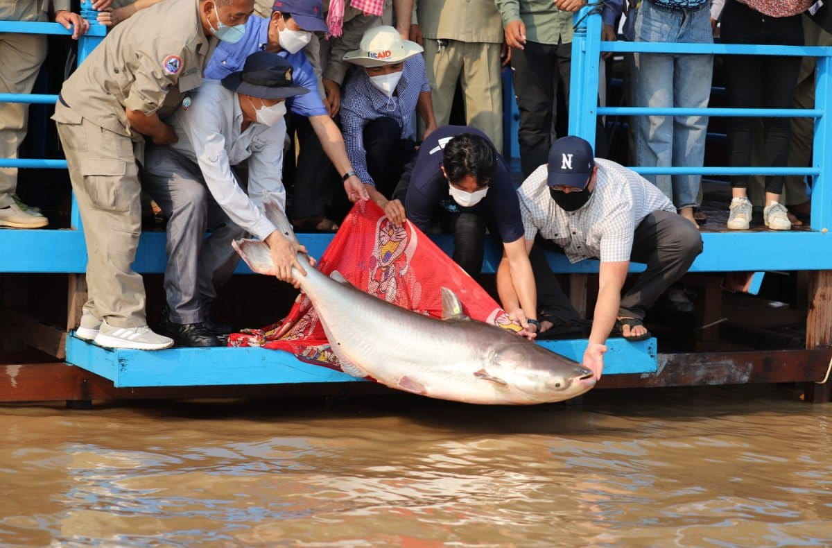 Banner image: A Mekong giant catfish measuring roughly 1.6 meters (5 feet) is released into a fish sanctuary in Tonle Sap Lake, Cambodia in March, 2022. Photo courtesy of Wonders of the Mekong project