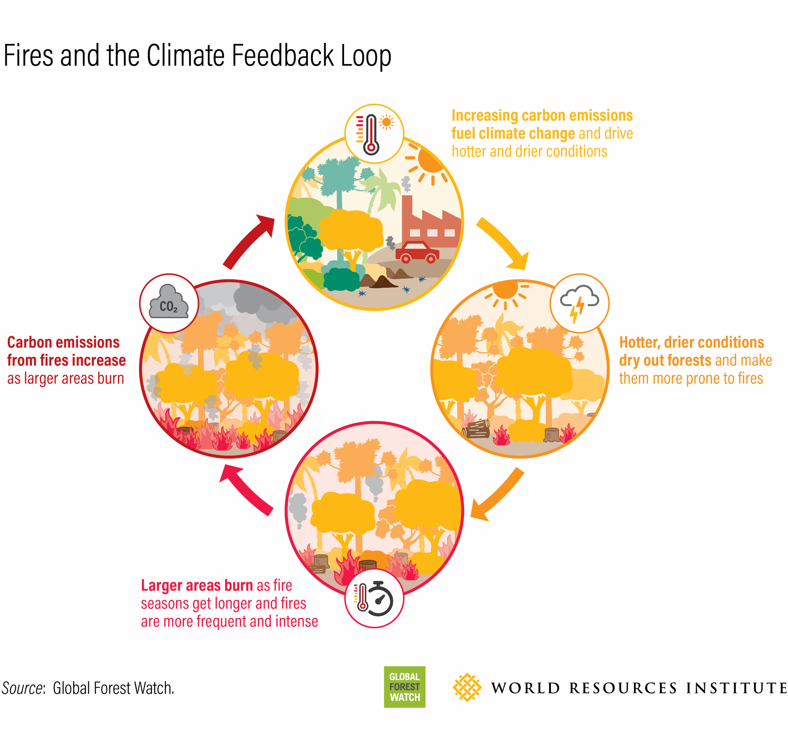 Warmer temperatures leave landscapes drier and more flammable. Drought and heat wave conditions allow fires to burn more completely and more severely, with longer-term impacts on surrounding ecosystems, as well as carbon storage. More burning means more carbon is released from soil and vegetation into the air, further warming the planet and exacerbating even more fires in a grim fire-climate feedback loop.