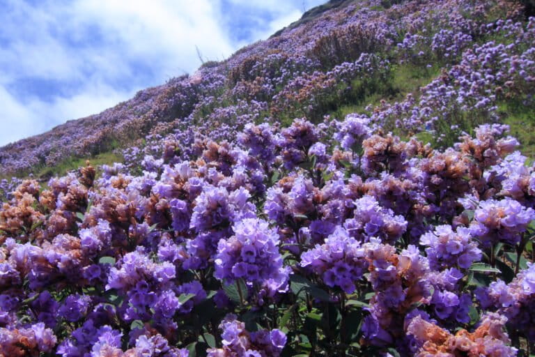 Strobilanthes shrubs bloom together, set seed and then die, transforming the landscape in a breathtaking but fleeting display of sheer floral beauty. Yet, behind this beauty lies a scientific mystery. These plants flower so rarely and in a perfectly synchronized manner. It only adds to the allure of this natural wonder, even as crowds flock to see the floral carpets, exerting new pressure on the fragile montane ecosystem.